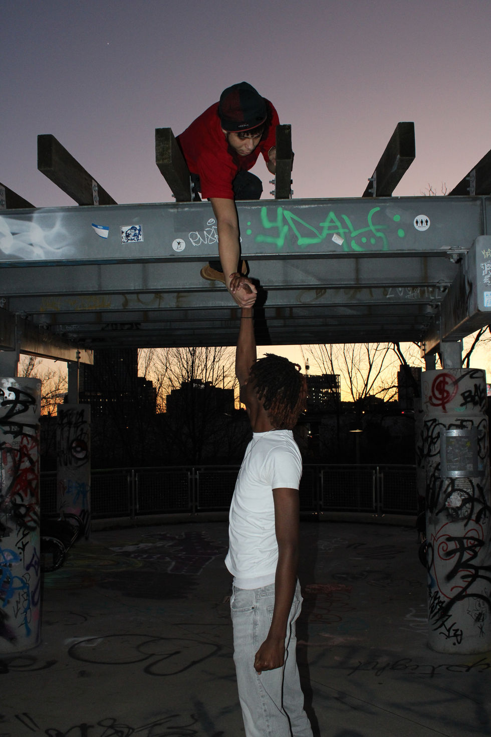 A compilation of images featuring people in urban settings at sunset, including graffiti-covered pillars and city skylines.